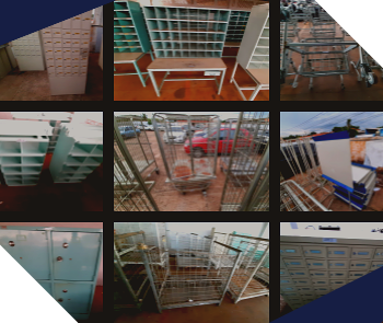 01 ESTAÇÃO DE TRABALHO DE FERRO (COMPOSTA POR MESA E ESTANTE DE APROX. 40 DIVISÓRIAS CADA)