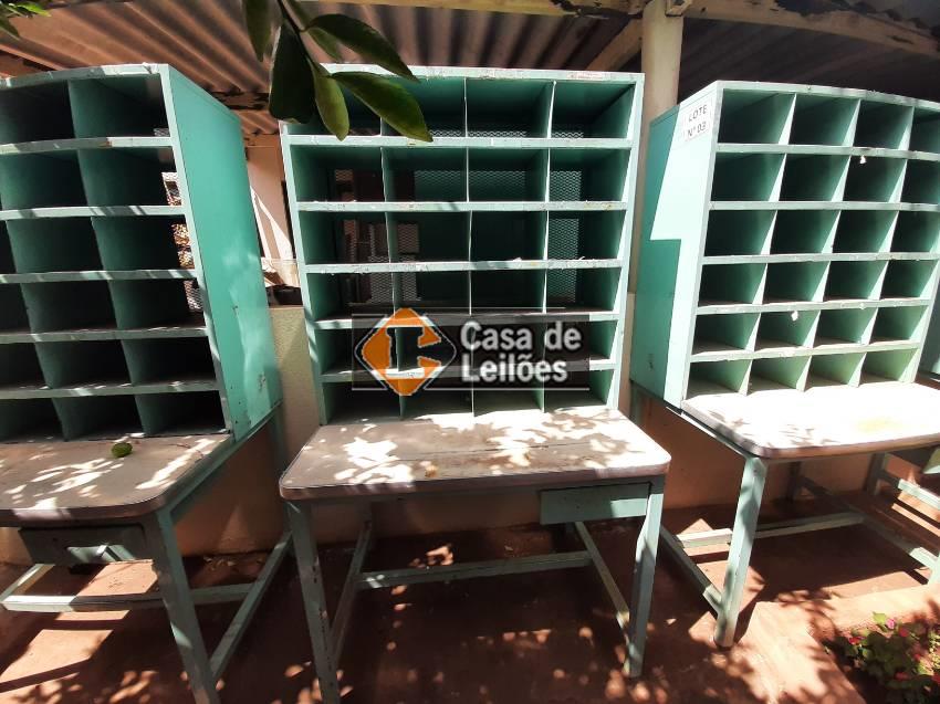 Lote: 002 - BENS MÓVEIS » DIVERSOS 01 ESTAÇÃO DE TRABALHO DE FERRO (COMPOSTA POR MESA COM GAVETA E ESTANTE DE 24 DIVISÓRIAS)