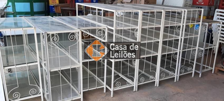 Lote: 02 - BENS MÓVEIS » MÓVEIS DIVERSOS 09 BALCÕES COM ESTRUTURA METALICA E PRATELEIRAS DE VIDRO