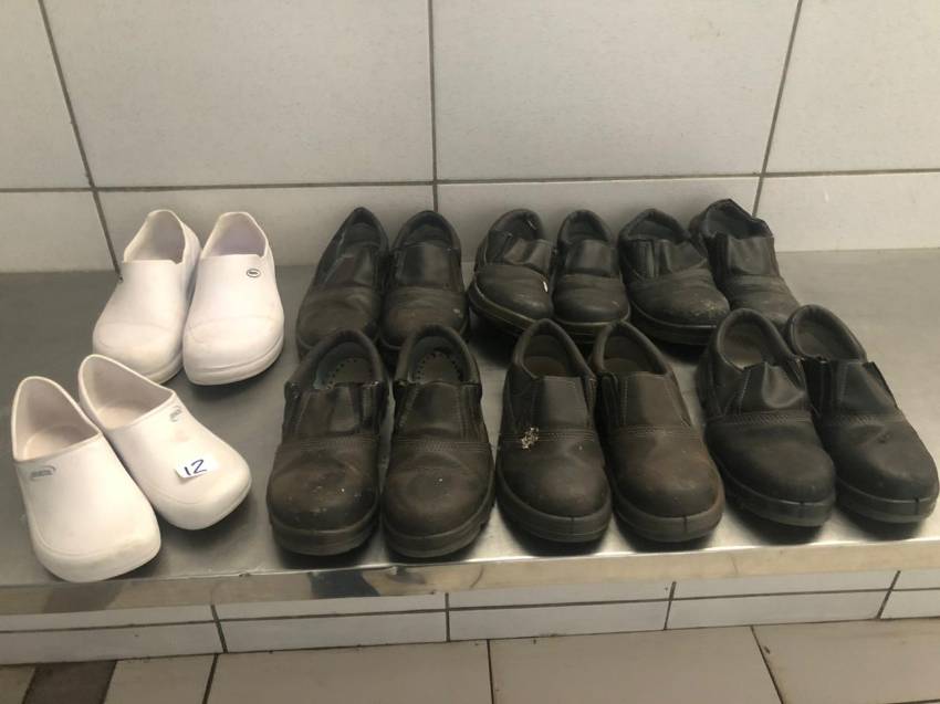 11 pares de sapatos de segurança para cozinha, diversos tamanhos.