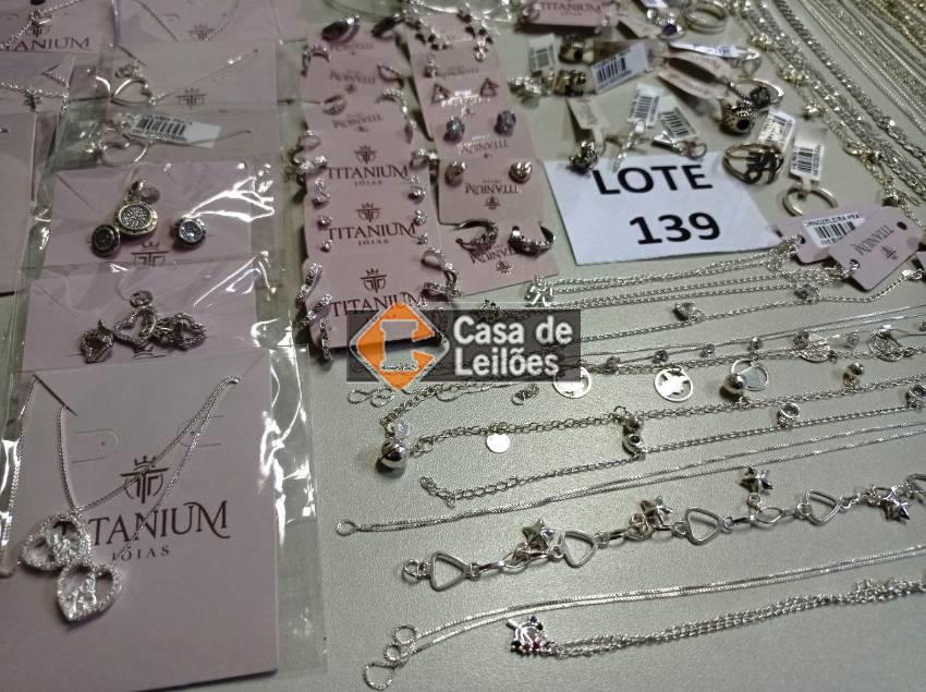 BIJOUTERIAS / SEMIJÓIAS PRATEADAS "TITANIUM": 39 UND ANÉIS; 46 UND PULSEIRAS; 30 UND CORRENTES / COLARES; 35 UND PINGENTES; 33 UND BRINCOS; 07 UND TORNOZELEIRAS; 06 UND CARTELA/TRIO DE BRINCOS; 04 UND CONJUNTOS.