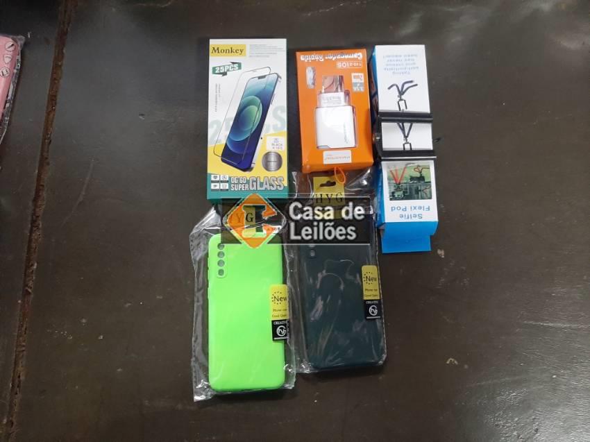 ACESSÓRIOS PARA SMARTPHONES: 10 UND CARREGADORES; 02 UND TRIPÉS; 02 UND FONES DE OUVIDO; 29 UND CAPINHAS / CASES; 250 UND PELÍCULAS (IPHONE, SAMSUNG E MOTOROLA).